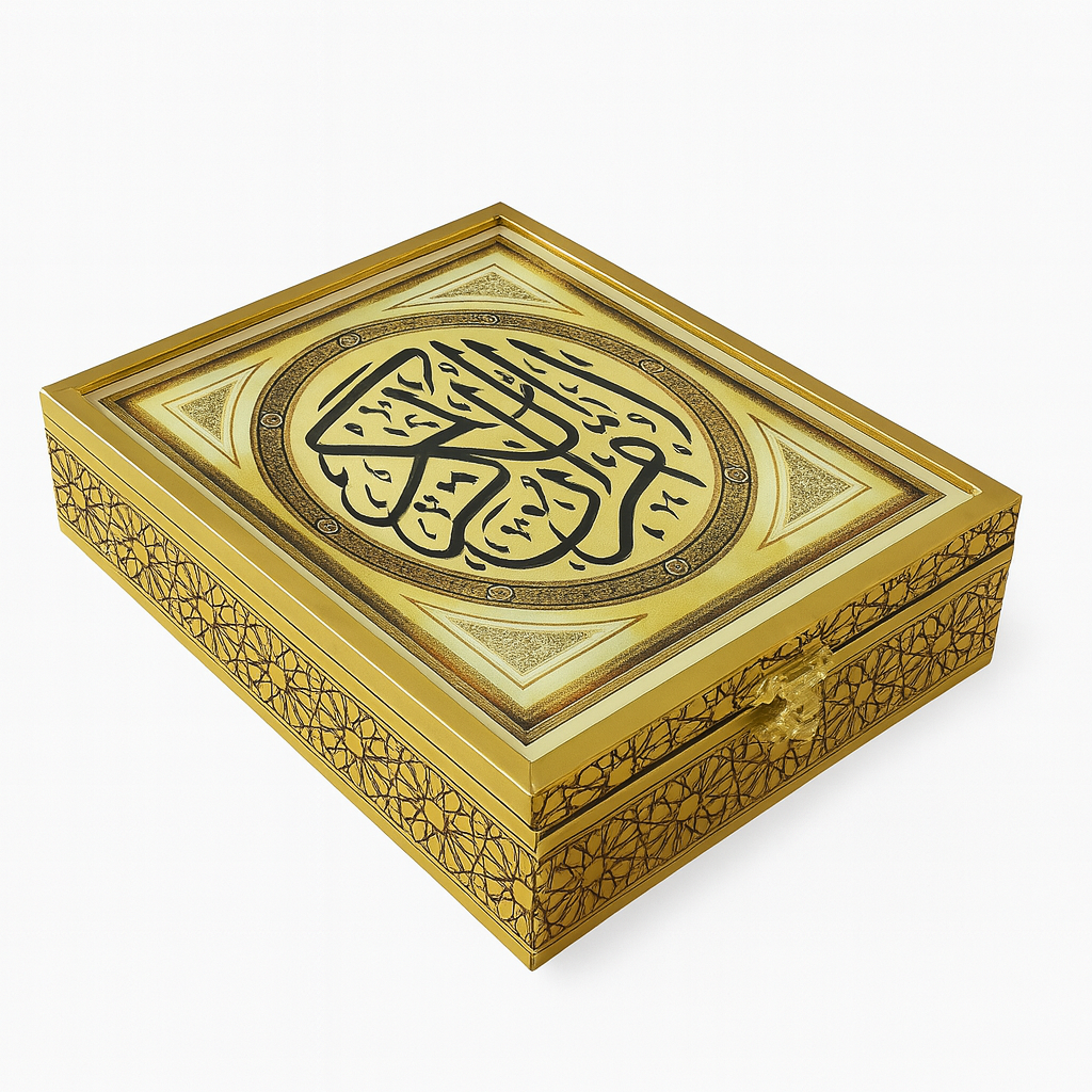 Découvrez le Coffret “Al-Hanâa blanc – Petit Format”, un écrin raffiné pensé pour sublimer le Saint Coran tout en s’intégrant facilement dans n’importe quel espace grâce à sa taille compacte. Sa structure dorée minutieusement travaillée et son couvercle orné d’une magnifique calligraphie en font une pièce décorative précieuse, à la fois élégante et sacrée.