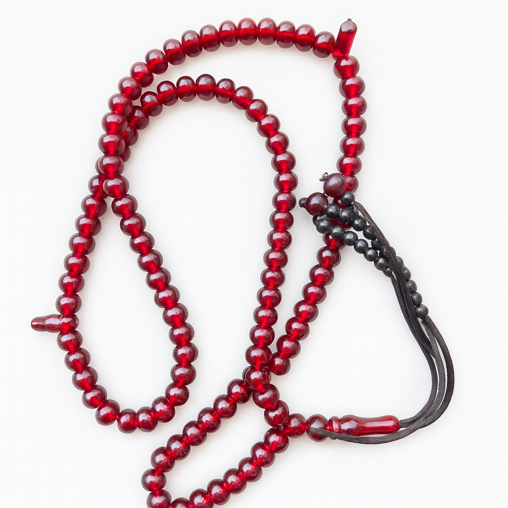 Chapelet de 99 perles rouge grenat, brillant et raffiné. Un modèle élégant et intense pour accompagner le dhikr ou offrir un cadeau spirituel.