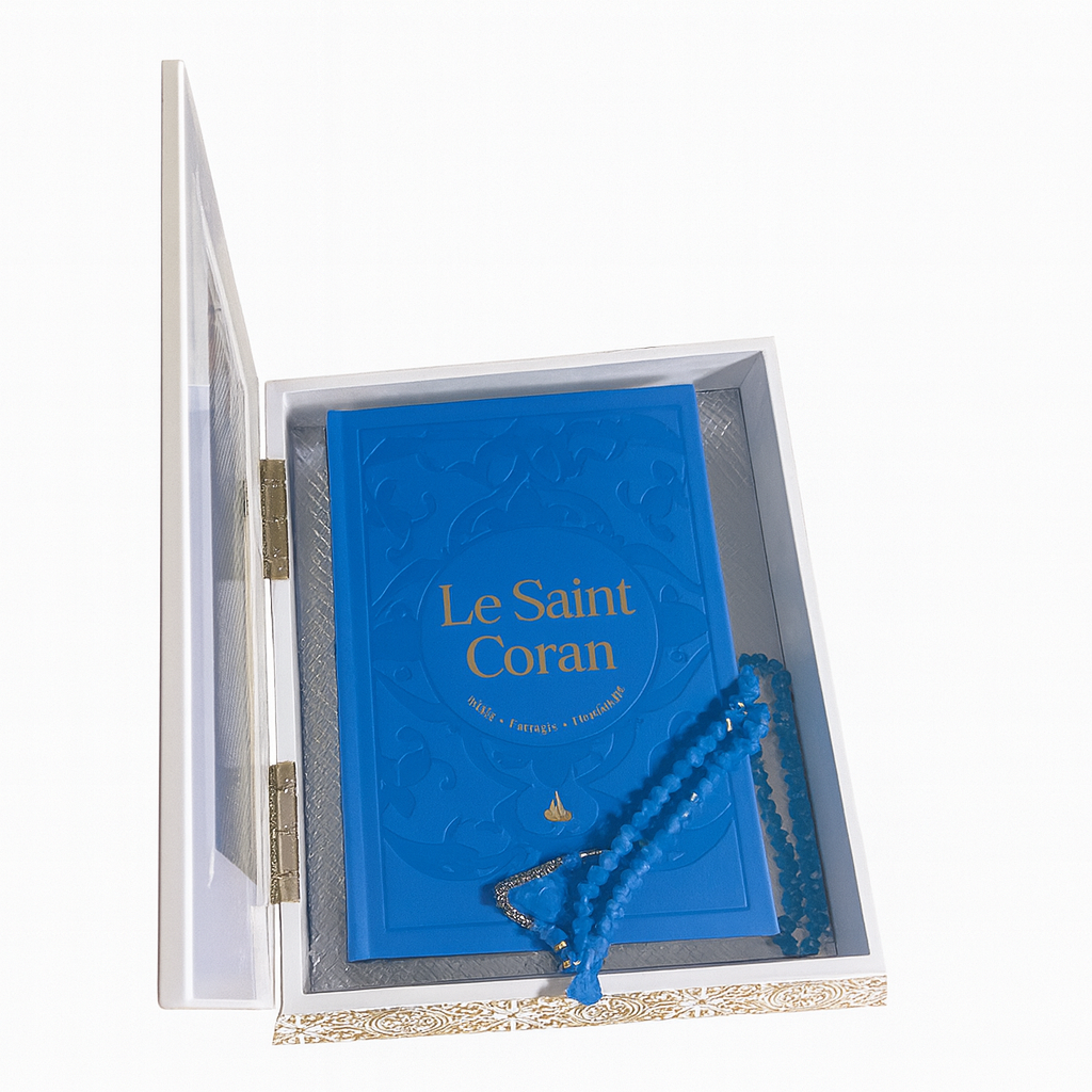 À l’intérieur, ce coffret renferme un Coran grand format rose mesurant 25 × 17 cm, comprenant :