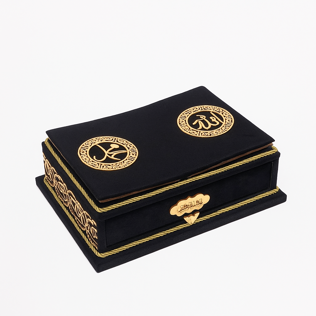 Coffret Coran en velours avec support pliable assorti, orné des emblèmes dorés “Allah” et “Muhammad ﷺ”. Un ensemble doux, élégant et spirituel, idéal comme cadeau ou pour sublimer votre coin prière.