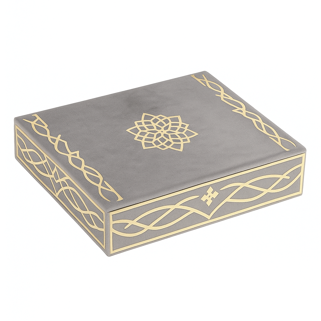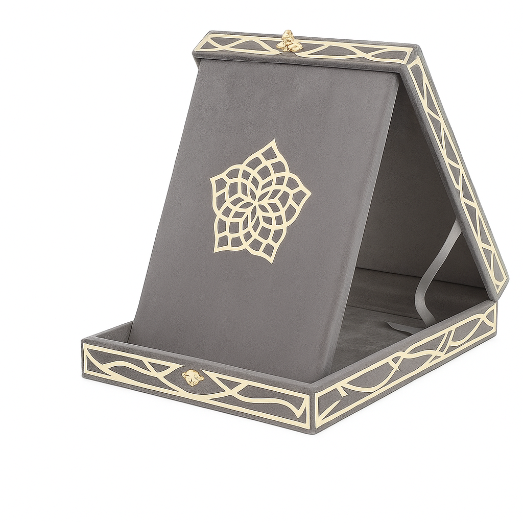 Découvrez Bahr Al-Ward, un coffret Coran luxueux au design délicat et raffiné. Entièrement habillé d’un velours gris, il est sublimé par de magnifiques motifs dorés qui lui donnent un charme élégant et intemporel.