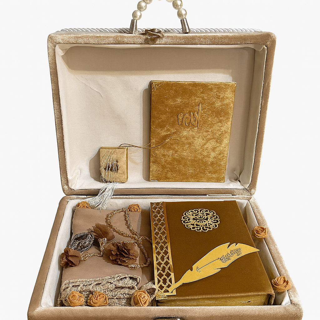 Le coffret Soumaya est une véritable invitation à la spiritualité et à l’élégance. Présenté sous forme d’une valisette en velours doux à la texture raffinée et au design fleuri délicat, il incarne le charme intemporel et la grâce du cadeau islamique haut de gamme.