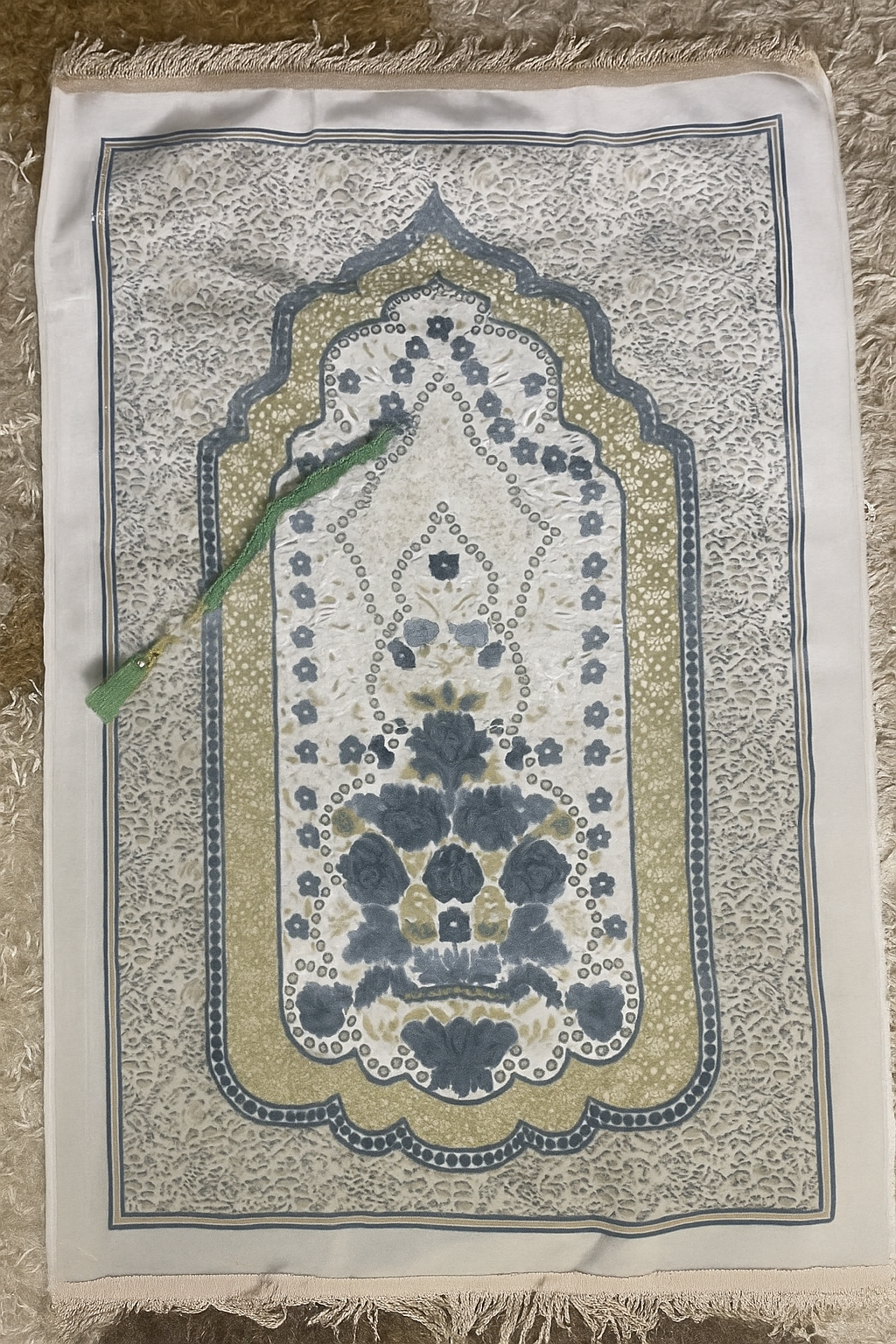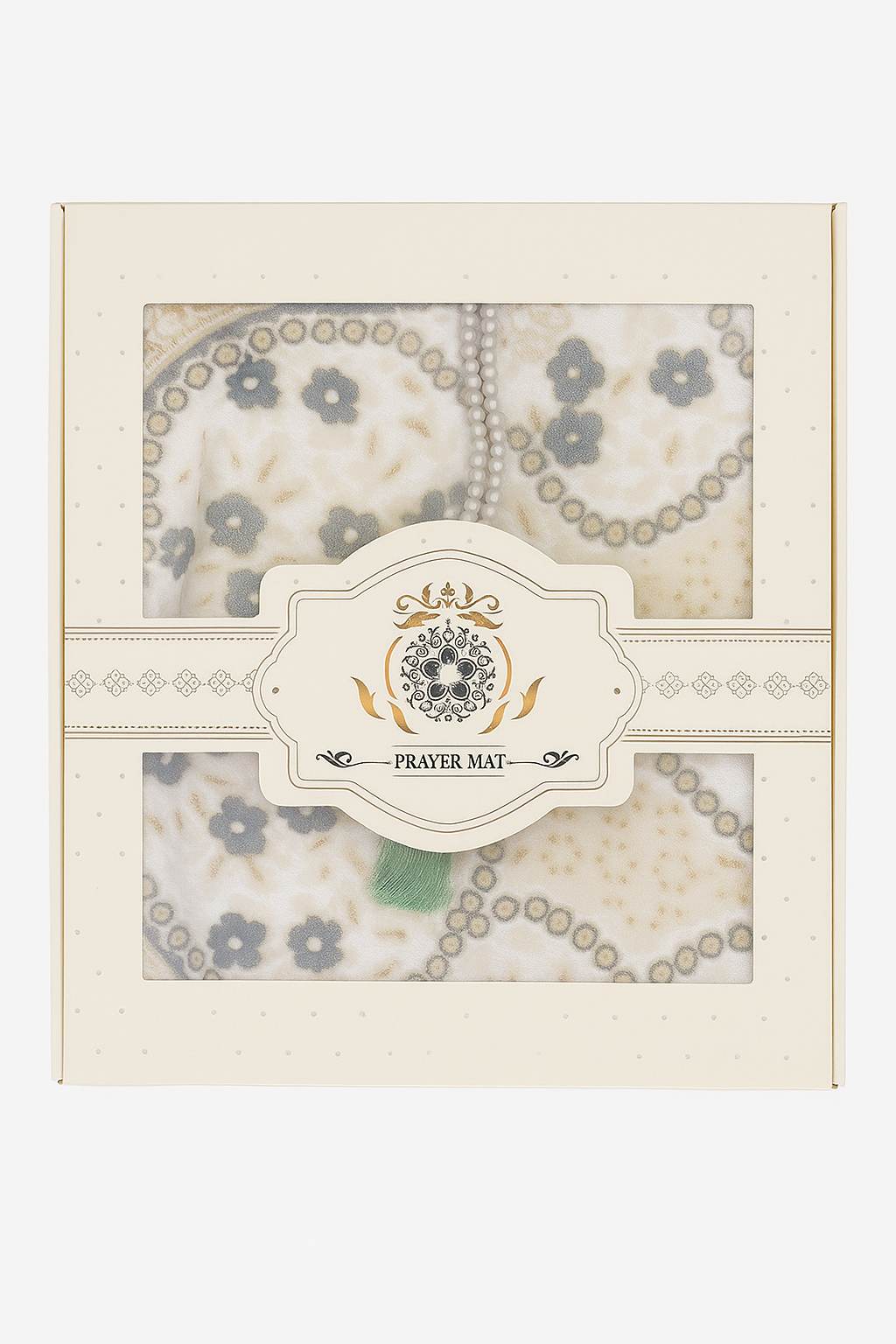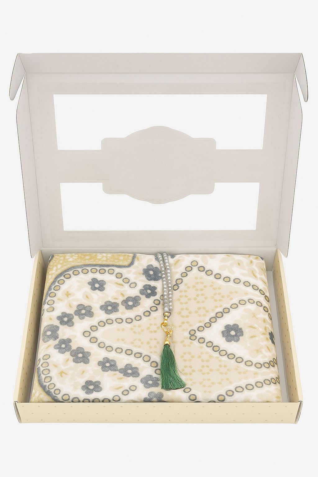 Composé d’un tapis de prière en tissu satiné, aux motifs floraux délicats dans des tons crème, gris et doré, et d’un chapelet assorti, ce coffret est une véritable invitation à la sérénité.