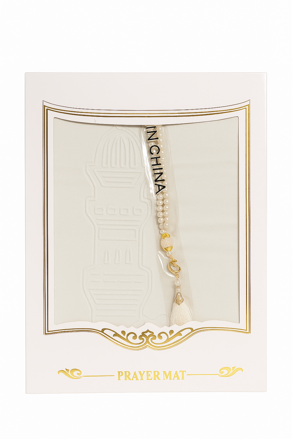 Coffret “Noor Al Qalb” – Tapis crème   velouté avec chapelet assorti crème  et doré.
