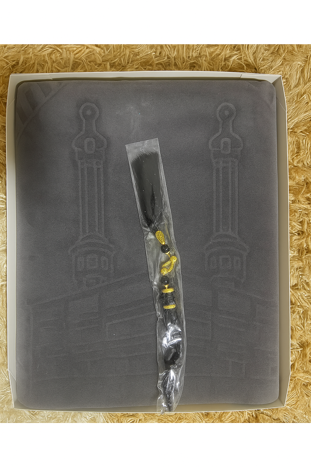 Coffret “Noor Al Qalb” – Tapis gris velouté avec chapelet assorti gris et doré.