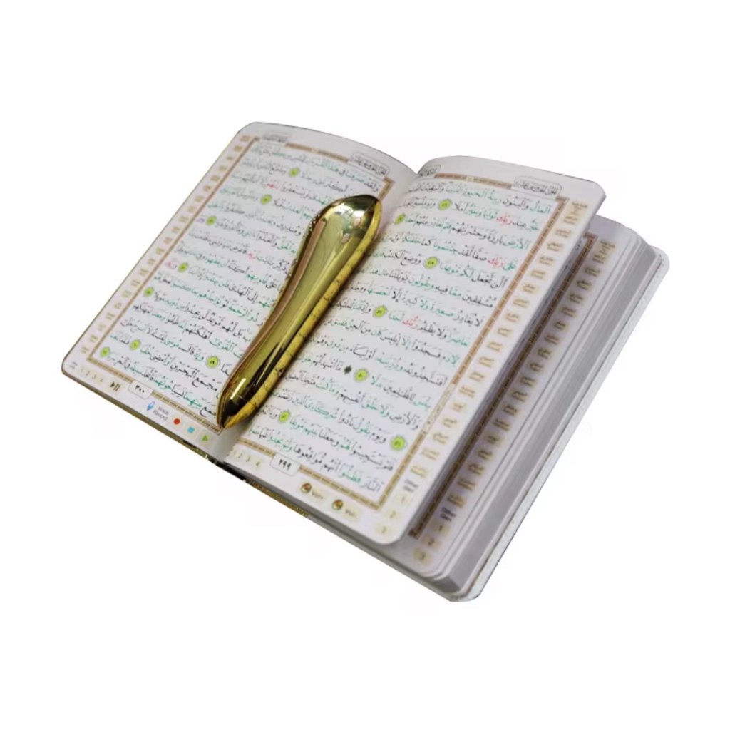 - 📖 Stylo lecteur doré + Coran doré grand format (17,2 × 24,3 cm)