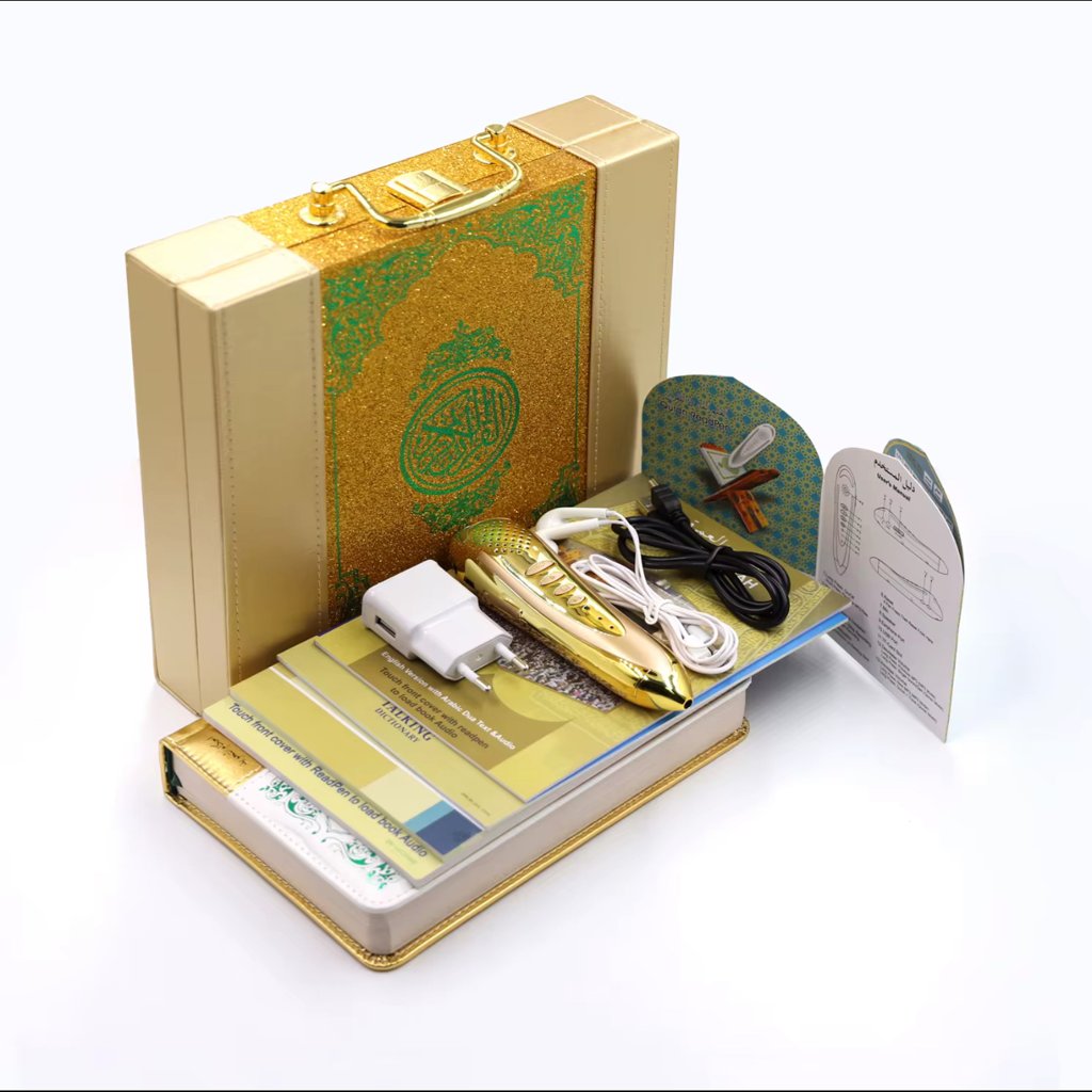 Cet ensemble complet se compose d’un stylo lecteur doré, d’un Coran doré grand format et d’une boîte de présentation élégante en cuir et bois doré.