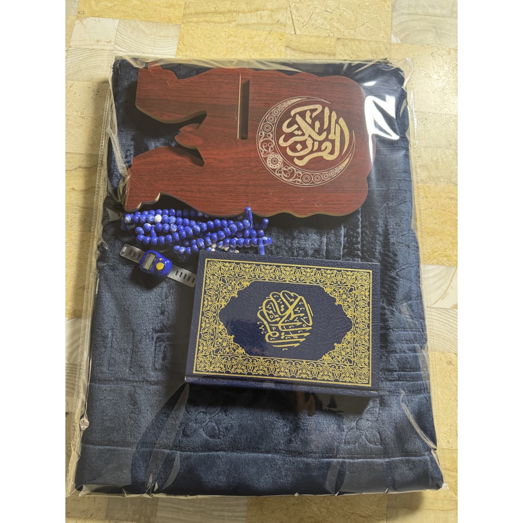 Coffret complet comprenant un Coran arabe (20×15 cm), un tapis velouté avec dossier pliable, un pose-Coran en bois sculpté, un chapelet manuel et un chapelet électronique.