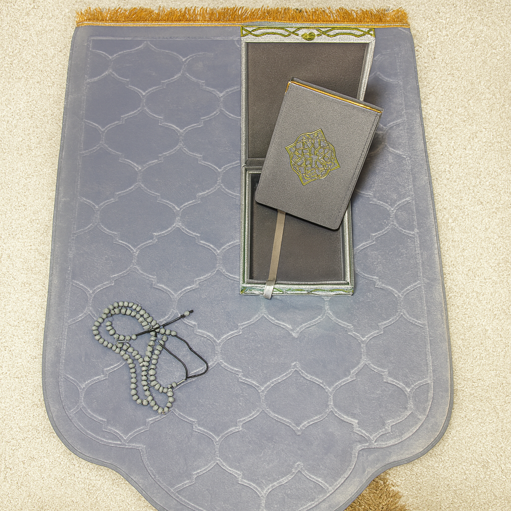 Il regroupe un tapis de prière en velours gris, un coffret Coran assorti, un Coran gris coordonné, ainsi qu’un chapelet gris pour une parfaite unité visuelle.