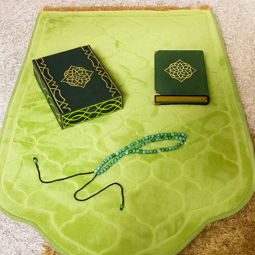 Il regroupe un tapis de prière en velours vert clair, un coffret Coran vert foncé, un Coran assorti, ainsi qu’un chapelet coordonné, formant un ensemble d’une grande cohérence visuelle.