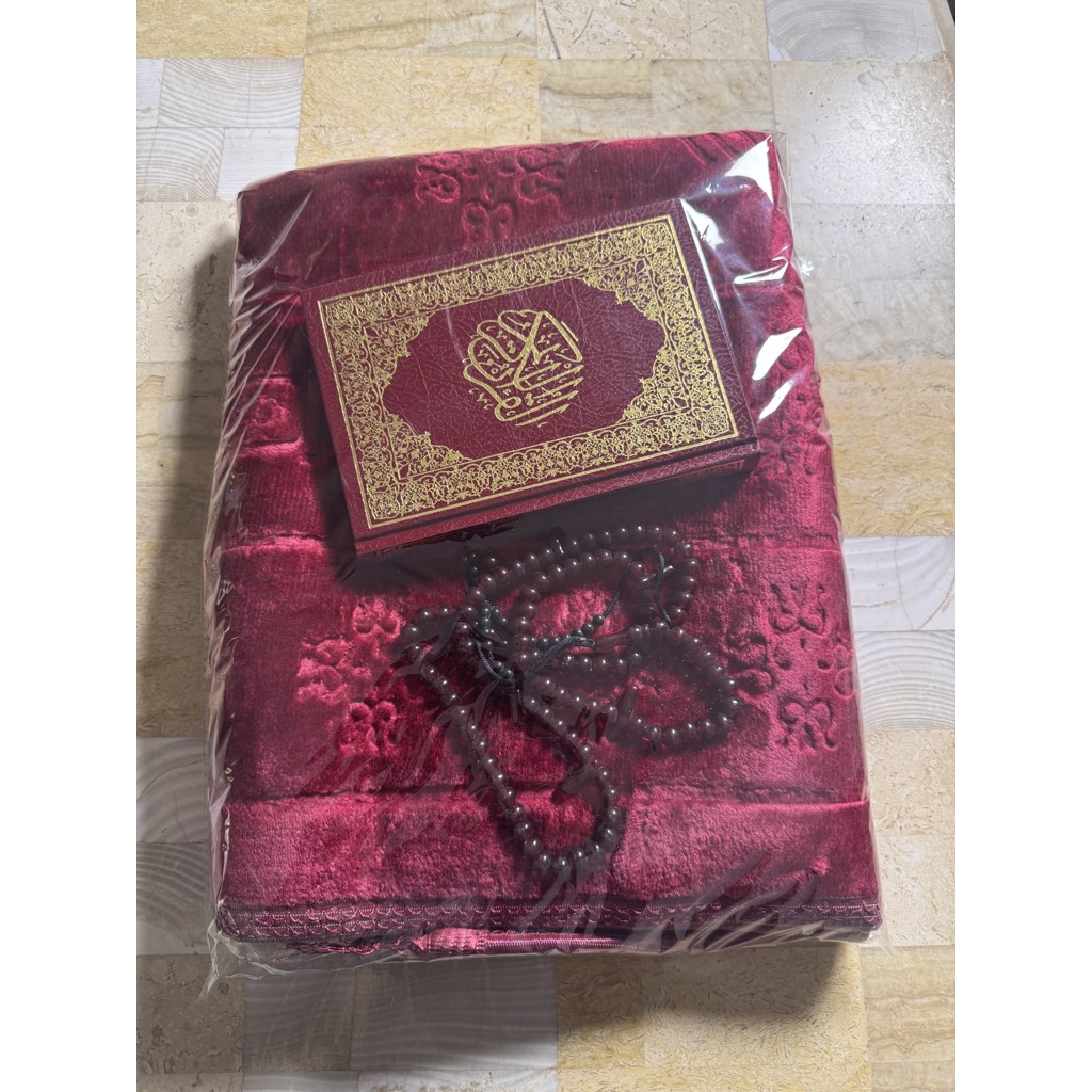 Pack “Xeweul” : un ensemble spirituel complet à prix doux comprenant un Coran Arabe (20×15 cm), un chapelet manuel et un tapis de prière velouté rouge grand format (155×31 cm).