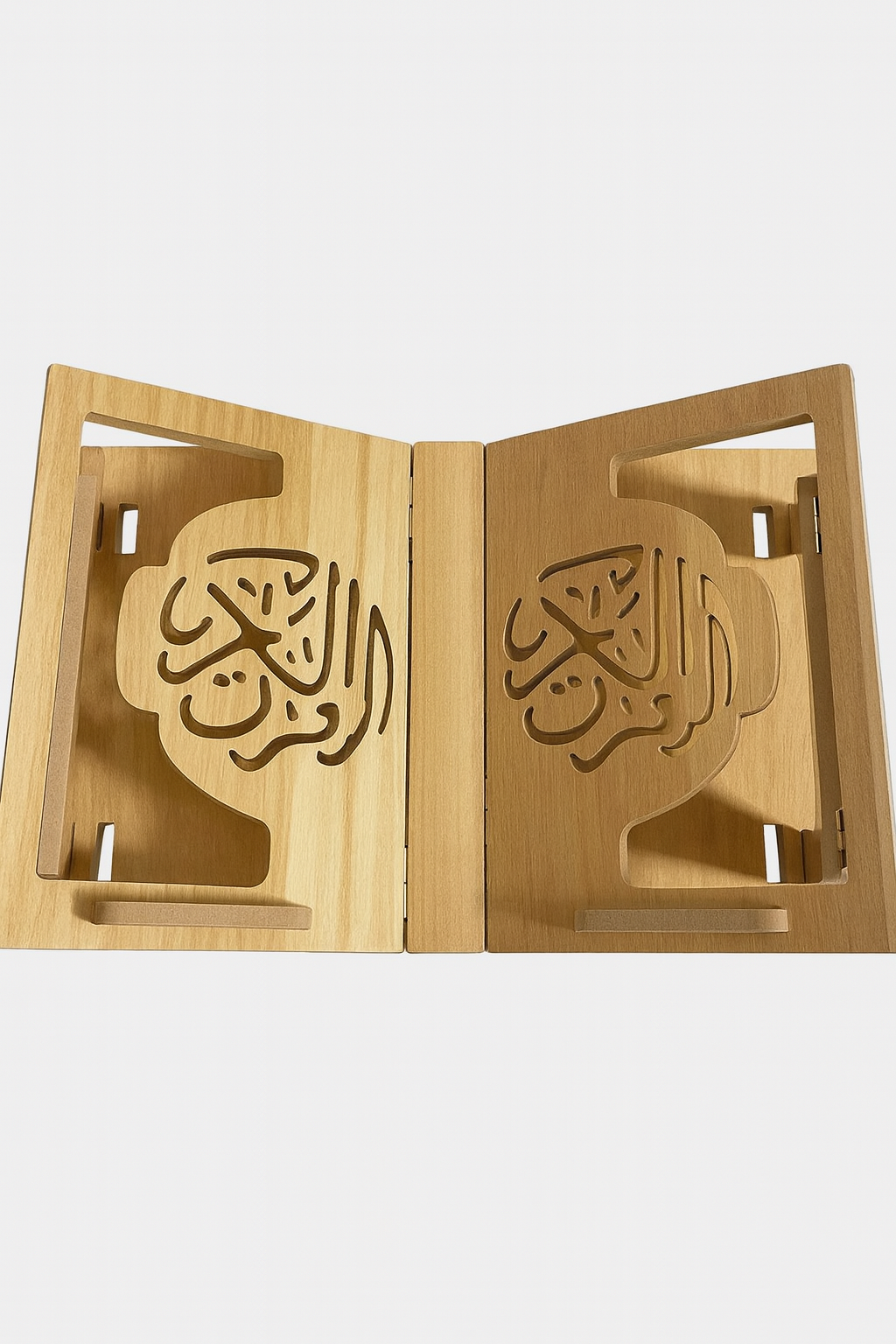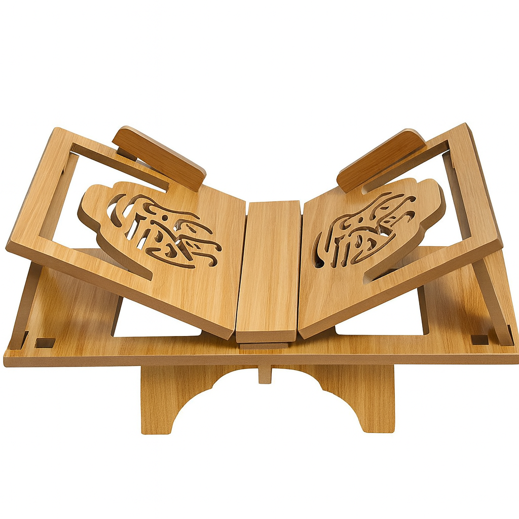 Ses panneaux sont magnifiquement ornés d’une calligraphie ajourée, découpée avec précision, offrant une touche artistique raffinée. Grâce à sa base solide et sa conception ergonomique, ce support assure une stabilité parfaite, que ce soit pour lire le Mushaf, des ouvrages religieux ou des livres d’étude.
