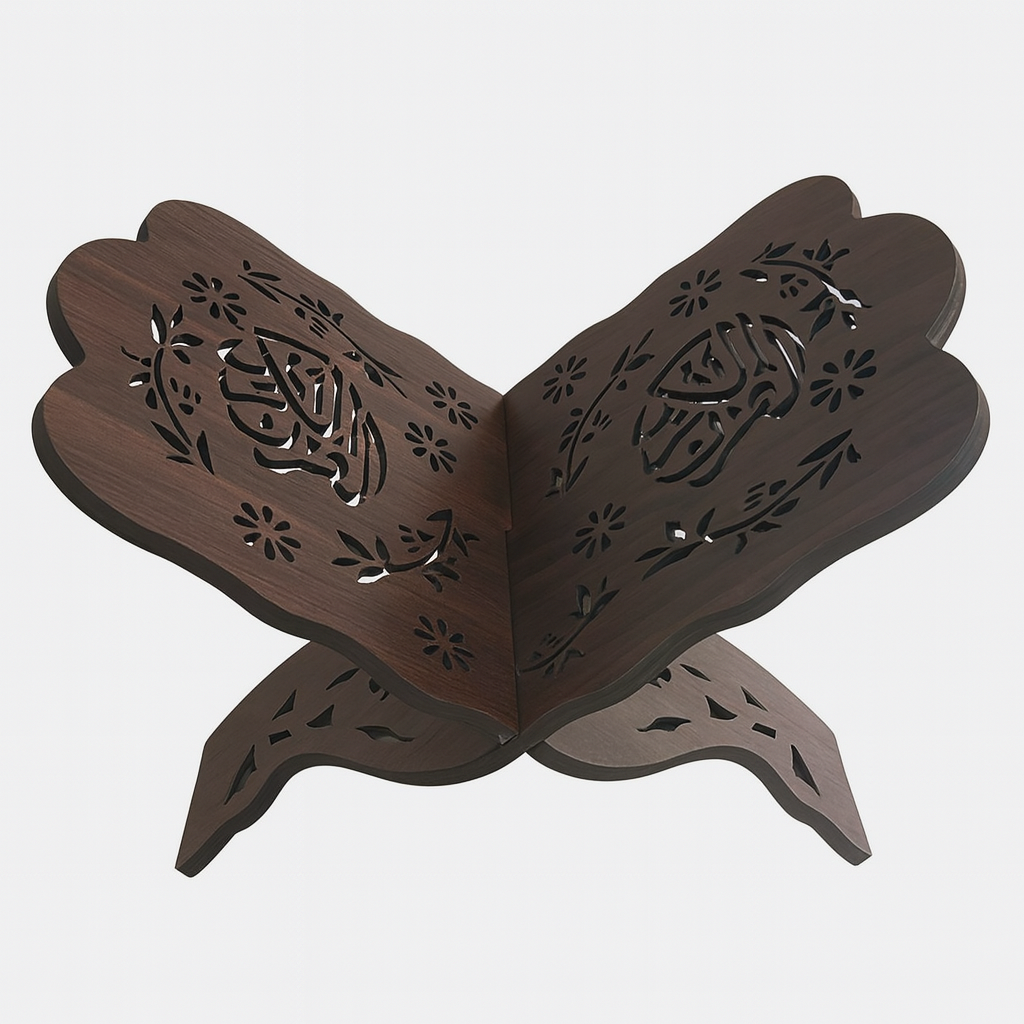 Découvrez ce sublime support Coran en bois foncé ajouré, une pièce élégante et artistique qui apportera une véritable présence spirituelle à votre espace de prière. Sa finition bois foncé, profonde et chaleureuse, met en valeur un travail délicat de motifs ajourés, finement découpés dans le bois : arabesques, fleurs et calligraphie subtilement intégrées.