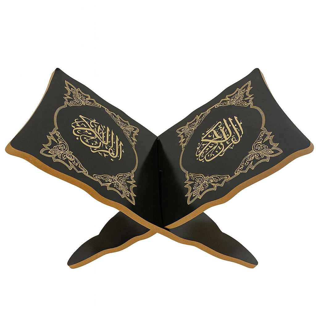 Élevez votre espace de prière avec ce magnifique support Coran noir et doré, au design noble et intemporel. Sa structure traditionnelle en rihal est sublimée par une finition noire profonde contrastée avec de délicates inscriptions et arabesques dorées, offrant un rendu luxueux et spirituel.