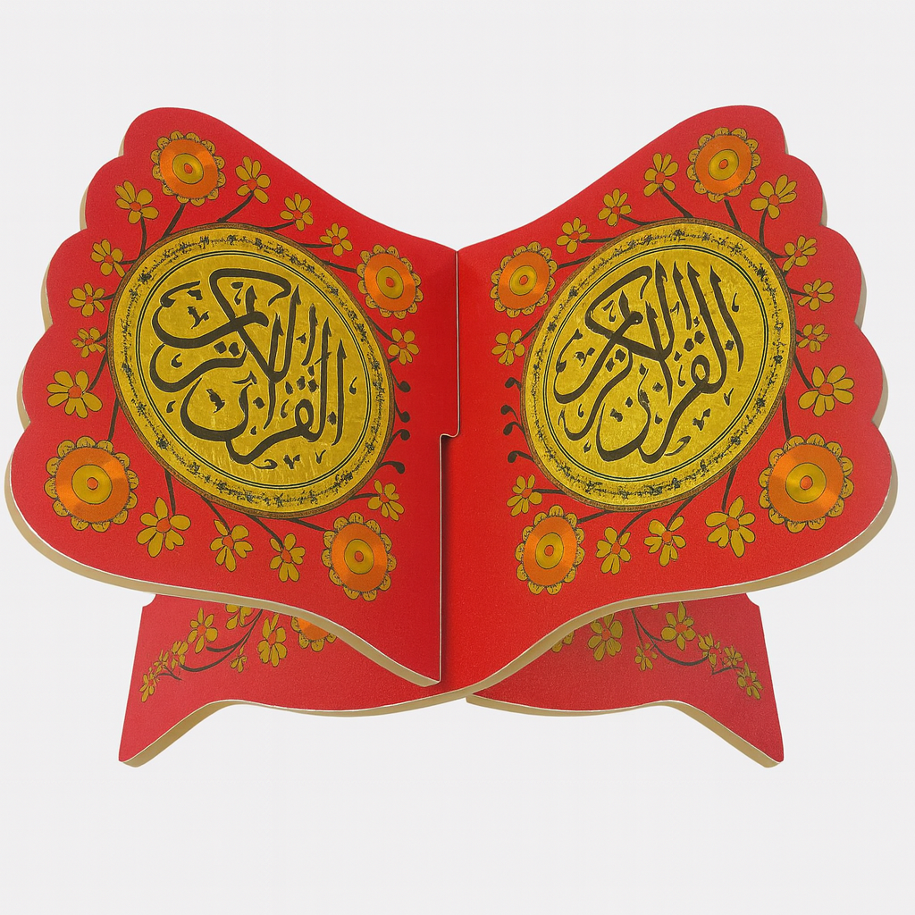 Support Coran en rihal, couleur rouge et doré, décoré de motifs floraux brillants. Solide, stable et élégant, il embellit parfaitement l’espace de prière et facilite la lecture du Mushaf.