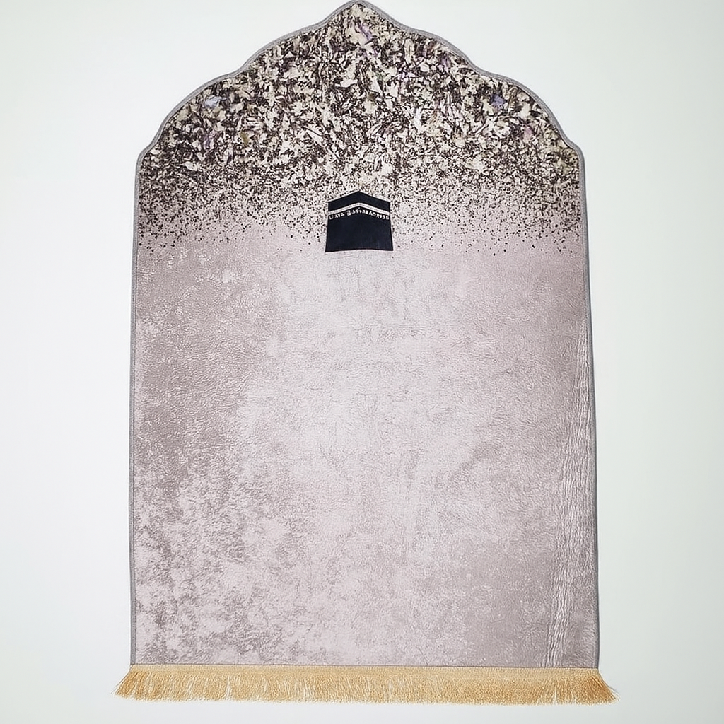 Apportez une touche d’élégance et de sérénité à vos moments de prière avec ce magnifique tapis de prière gris motif Kabaa.