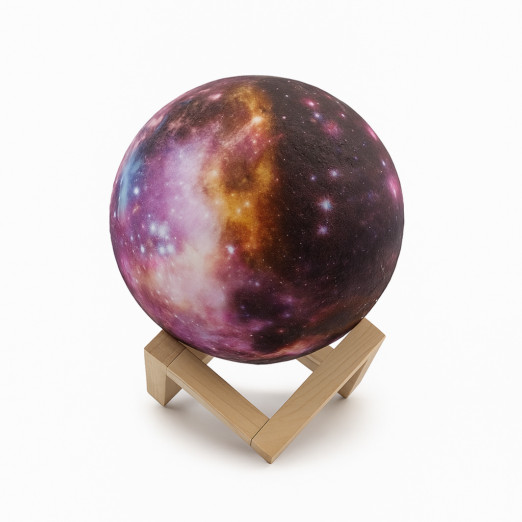 - Forme : sphérique (effet galaxie 3D) sur support en bois